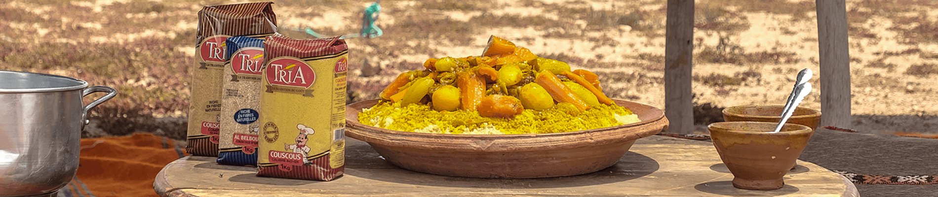 - Pour le couscous, on mélange 3 sortes de semoules : 2 bols de couscous moyen Tria, 1 bol de couscous complet Tria et 1 bol de couscous à l’orge/ Belboula Tria avec un peu d’eau et de sel à placer dans le panier du couscous qu’on pose sur la marmite.